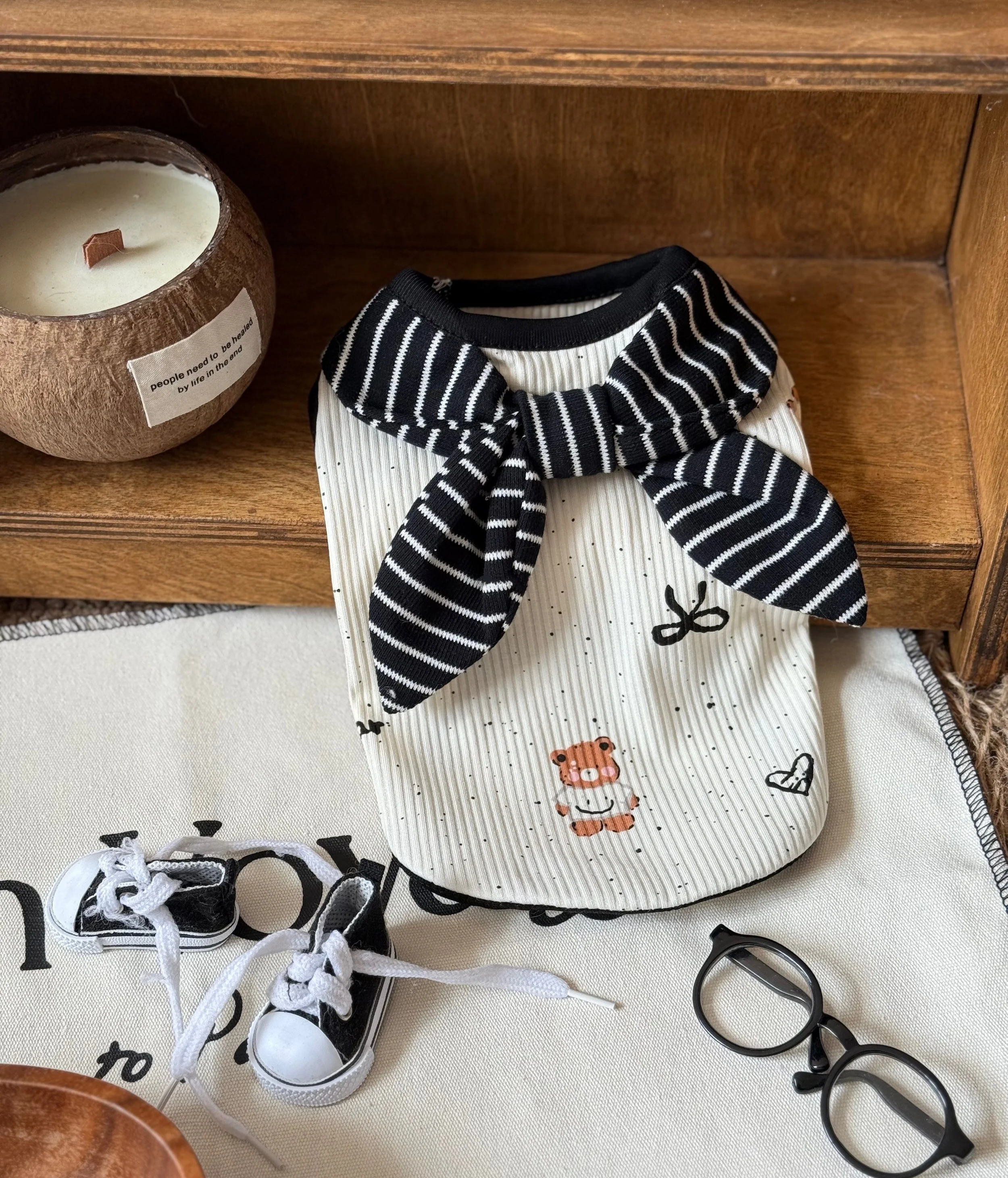 Dress your pet with timeless charm in our Little Bear with Bow Tie shirt. Designed with a soft, textured cream base and playful bear print, this outfit features a statement black-and-white striped bow collar that’s both adorable and elegant. Perfect for fashion-forward pups and cats, it’s ideal for café outings, photoshoots, and cozy indoor wear.