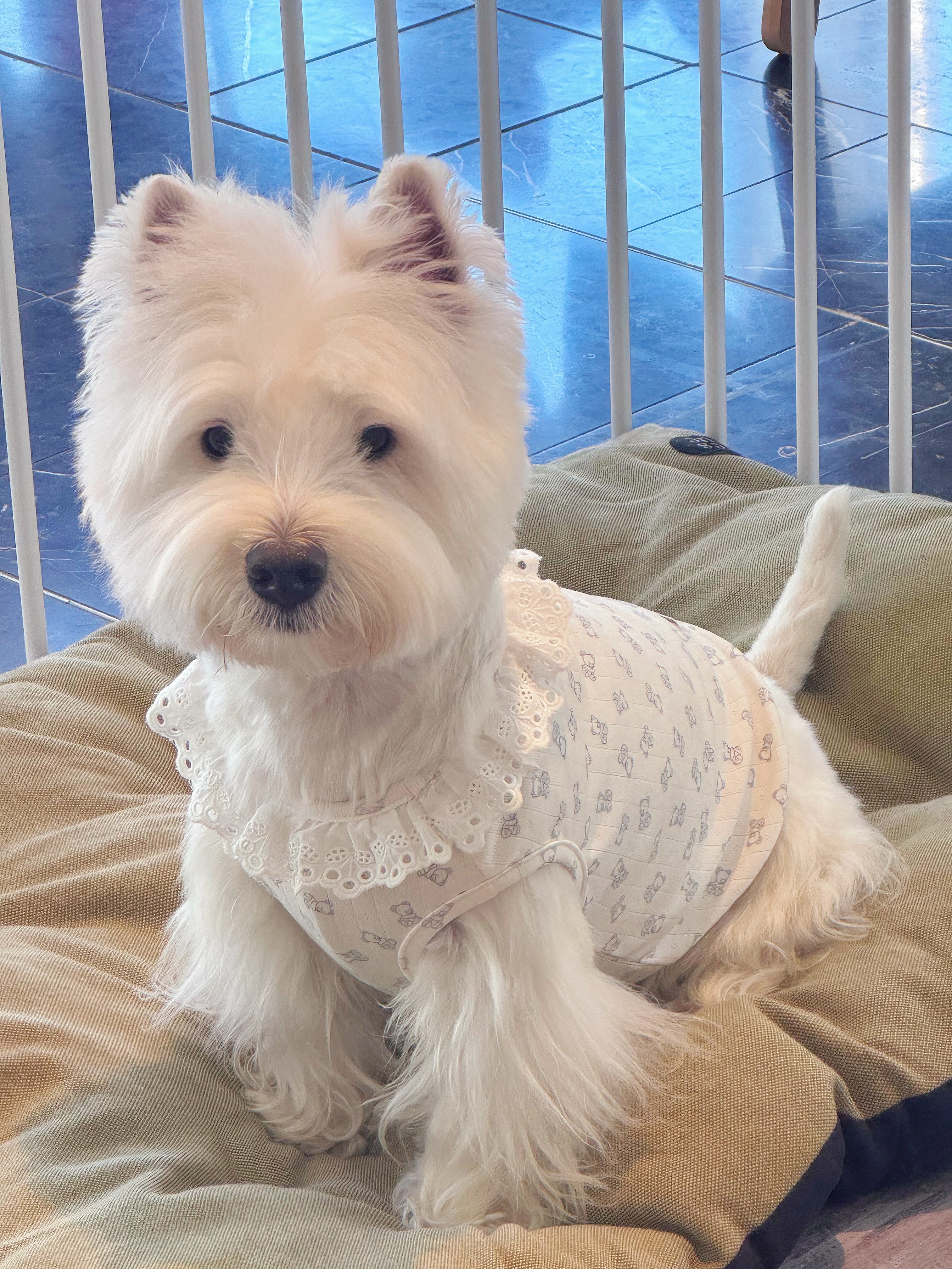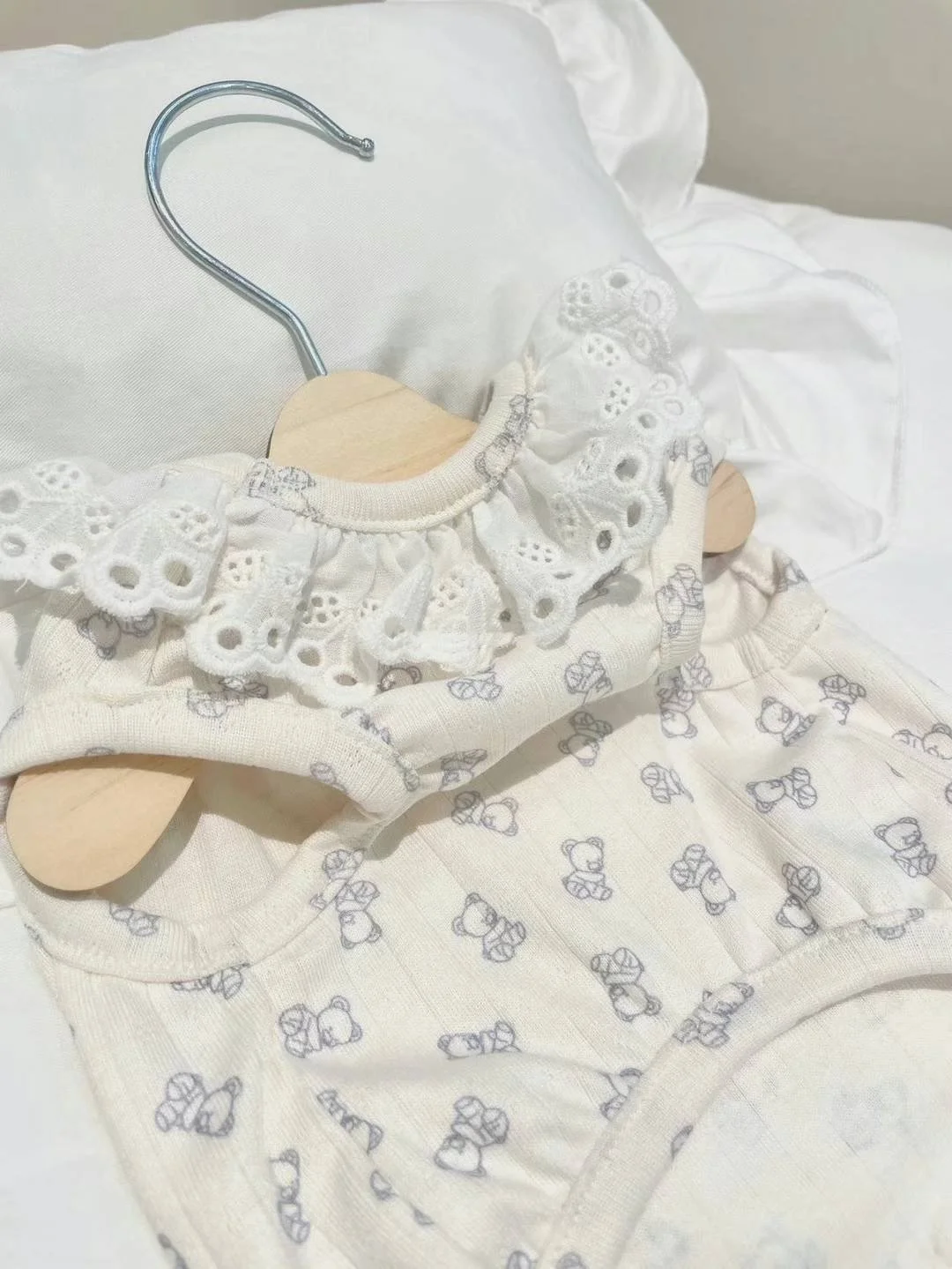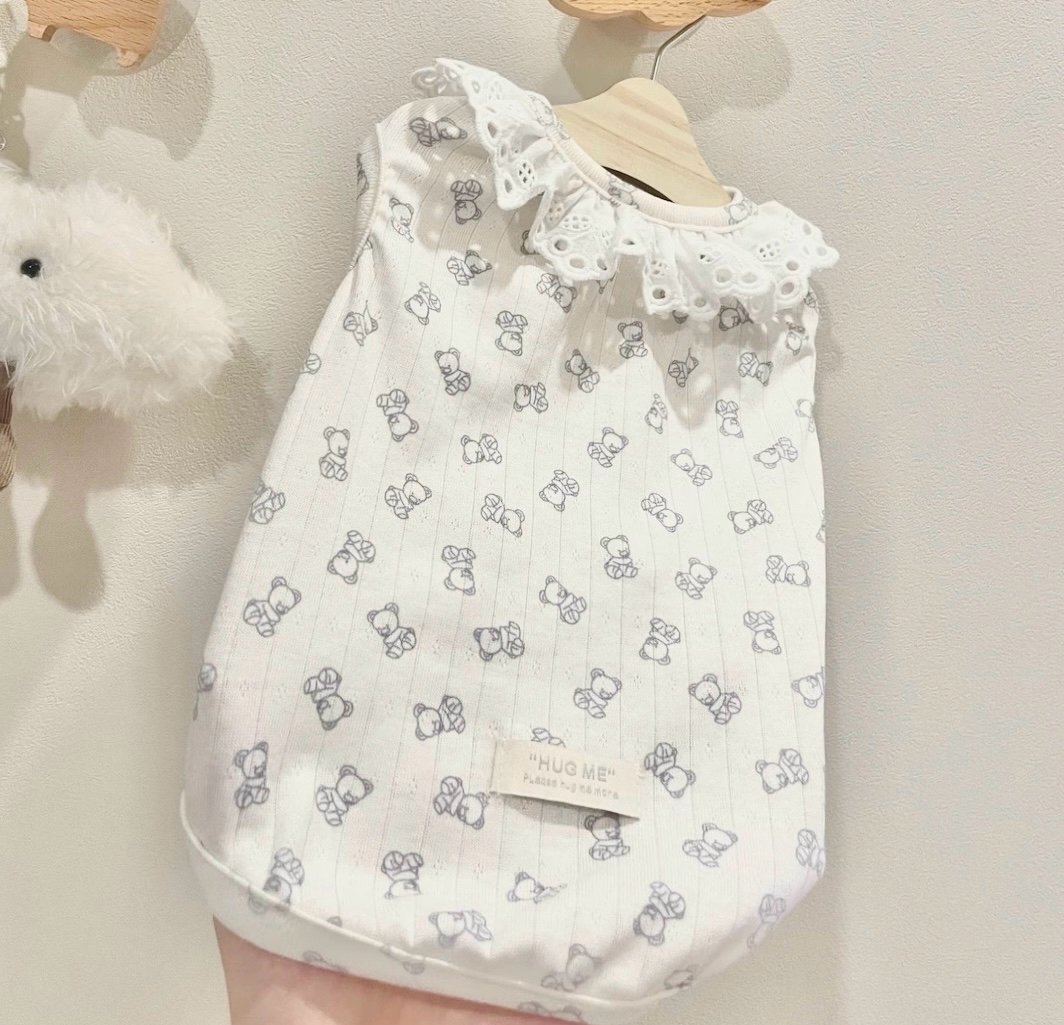 Wrap your furry friend in the gentle charm of our BM Teddy Breeze Soft Vest. Featuring a delicate eyelet lace collar and subtle teddy bear print, this vest blends cozy comfort with sweet, airy style—perfect for breezy days and indoor lounging. Made with breathable ribbed cotton for a soft, lightweight feel.