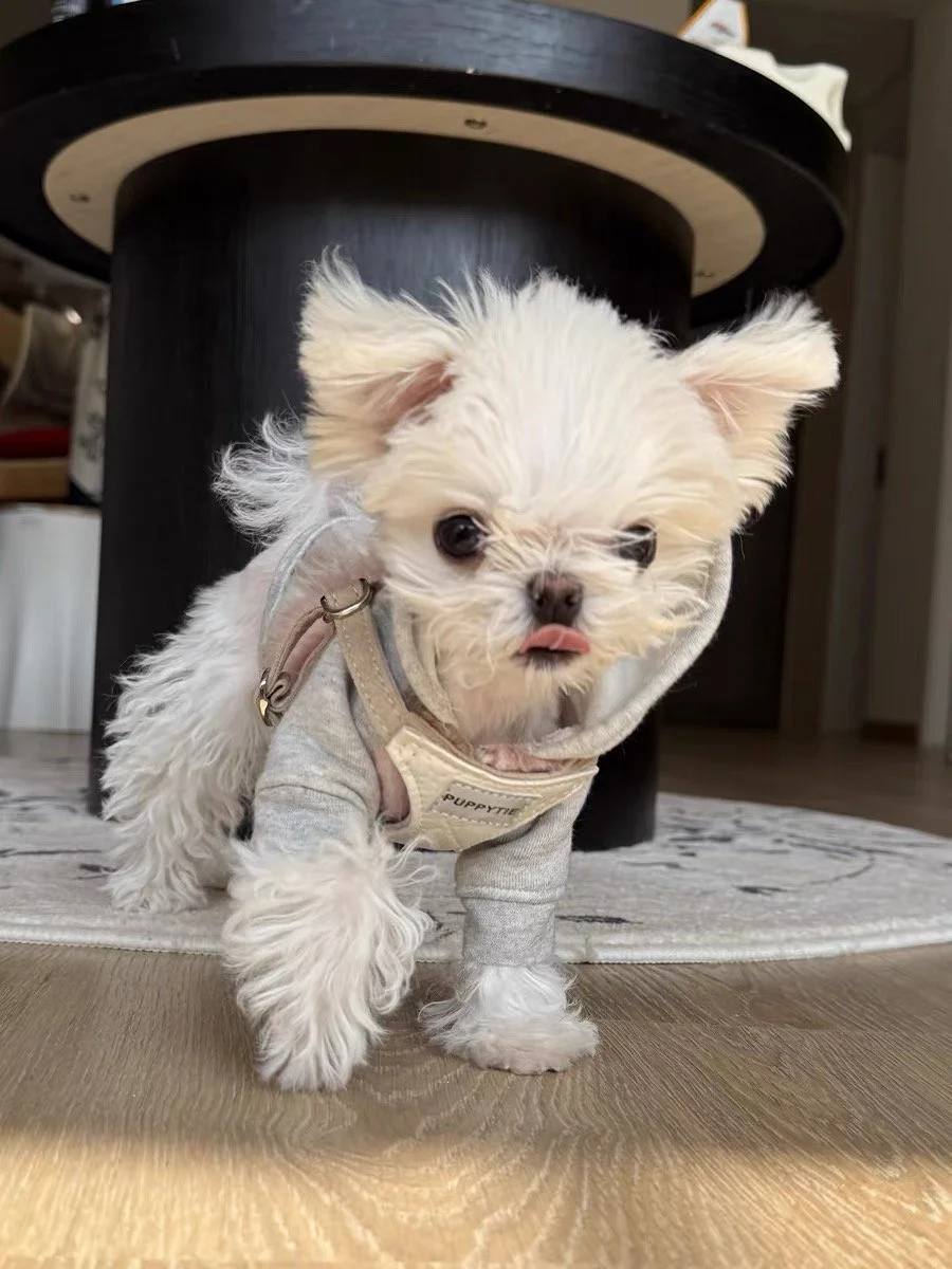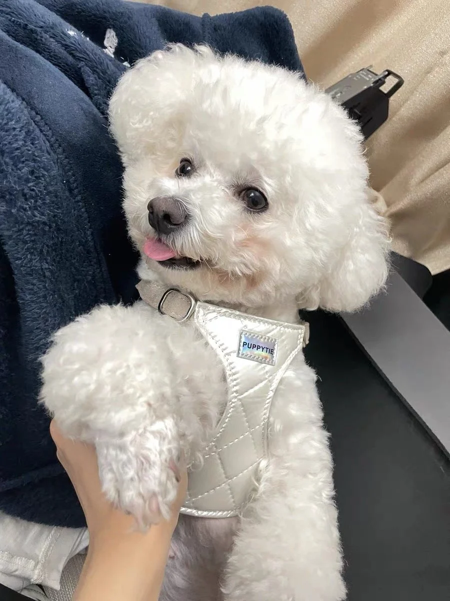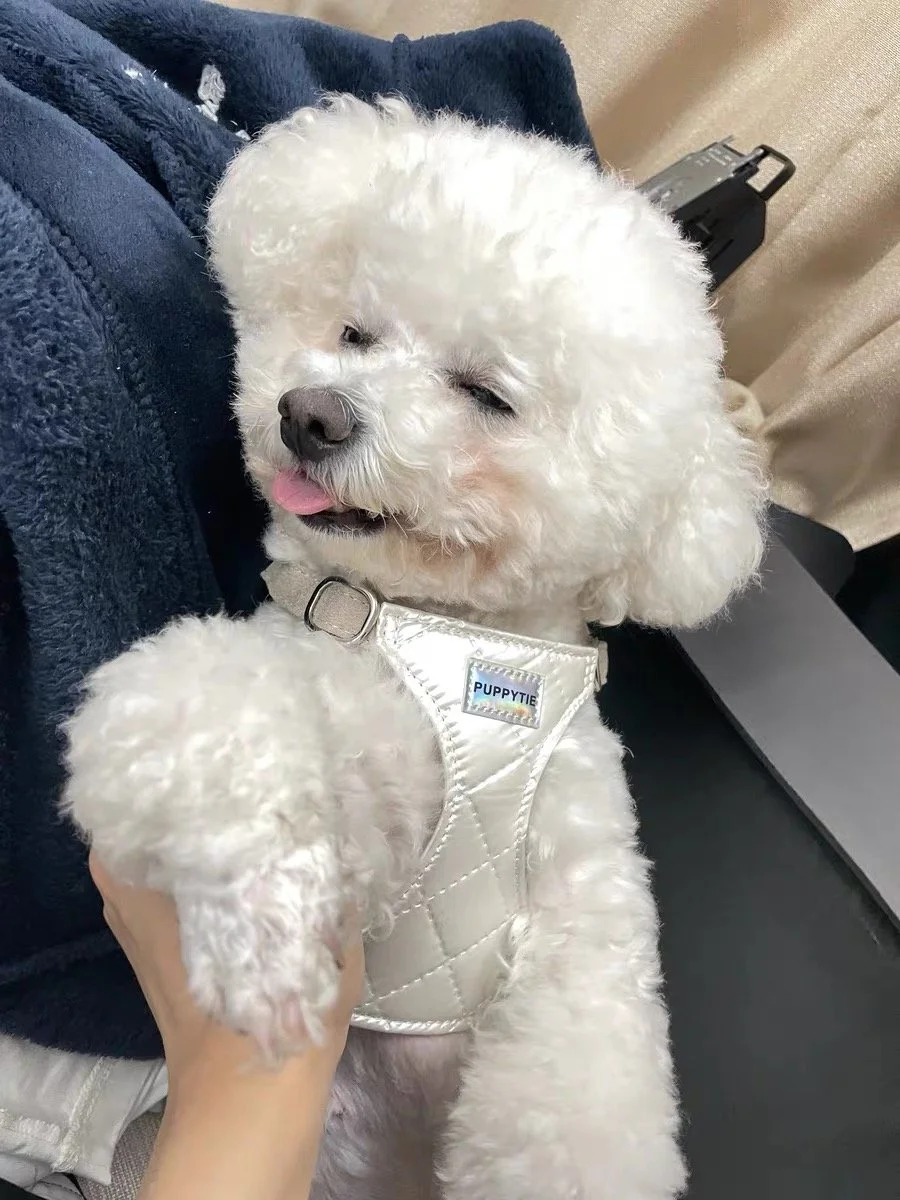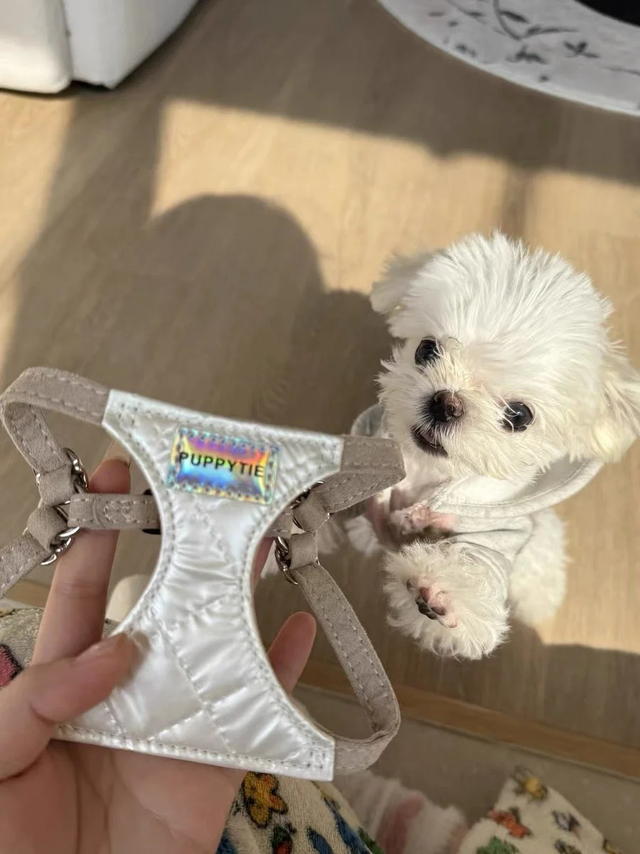 Shine in style with our CloudLite Reflective Dog Harness. Featuring a pearl-white quilted design with a light-reflective finish, this harness is both fashionable and functional—perfect for daily walks or special outings. Made from breathable materials with soft suede straps, it ensures all-day comfort with a premium look.