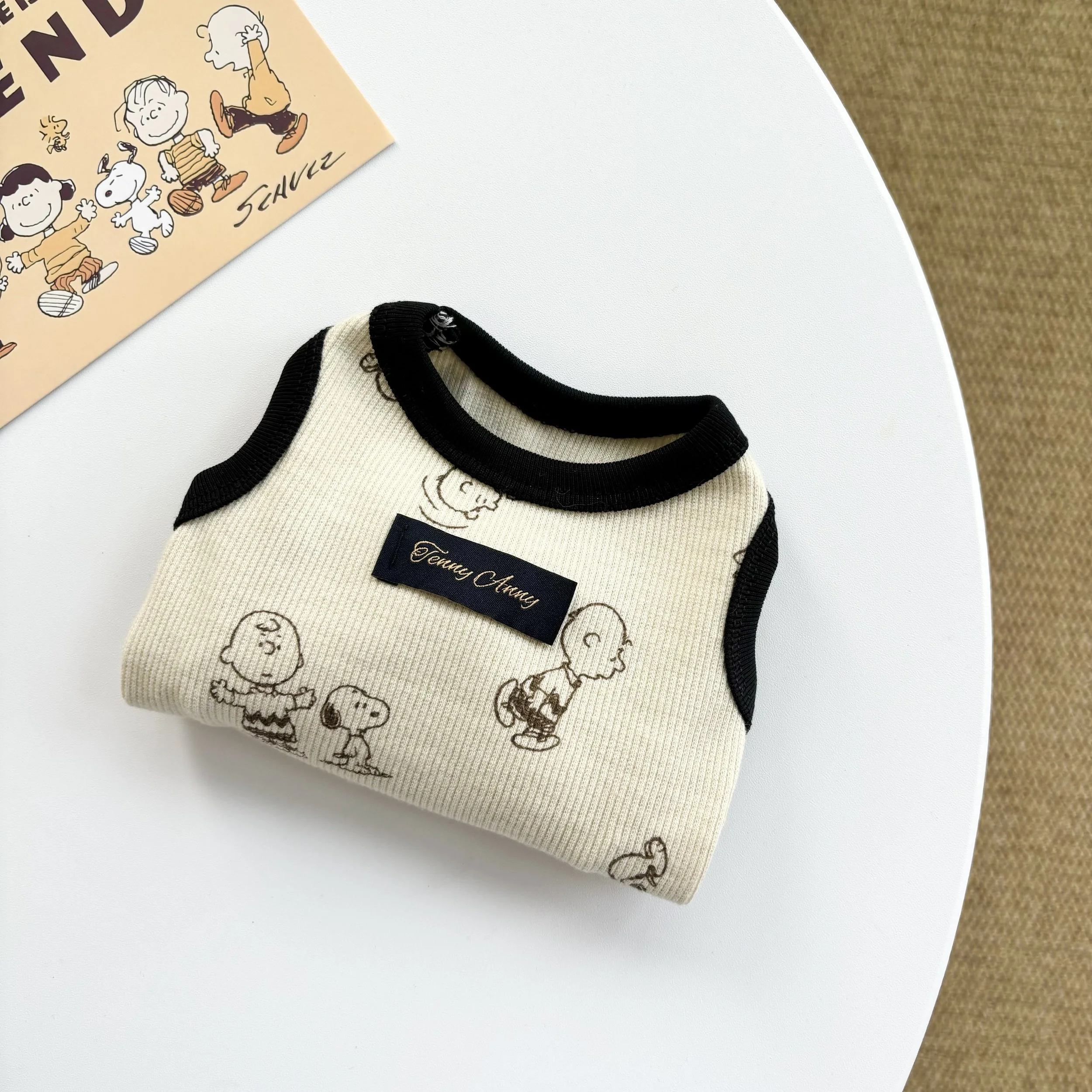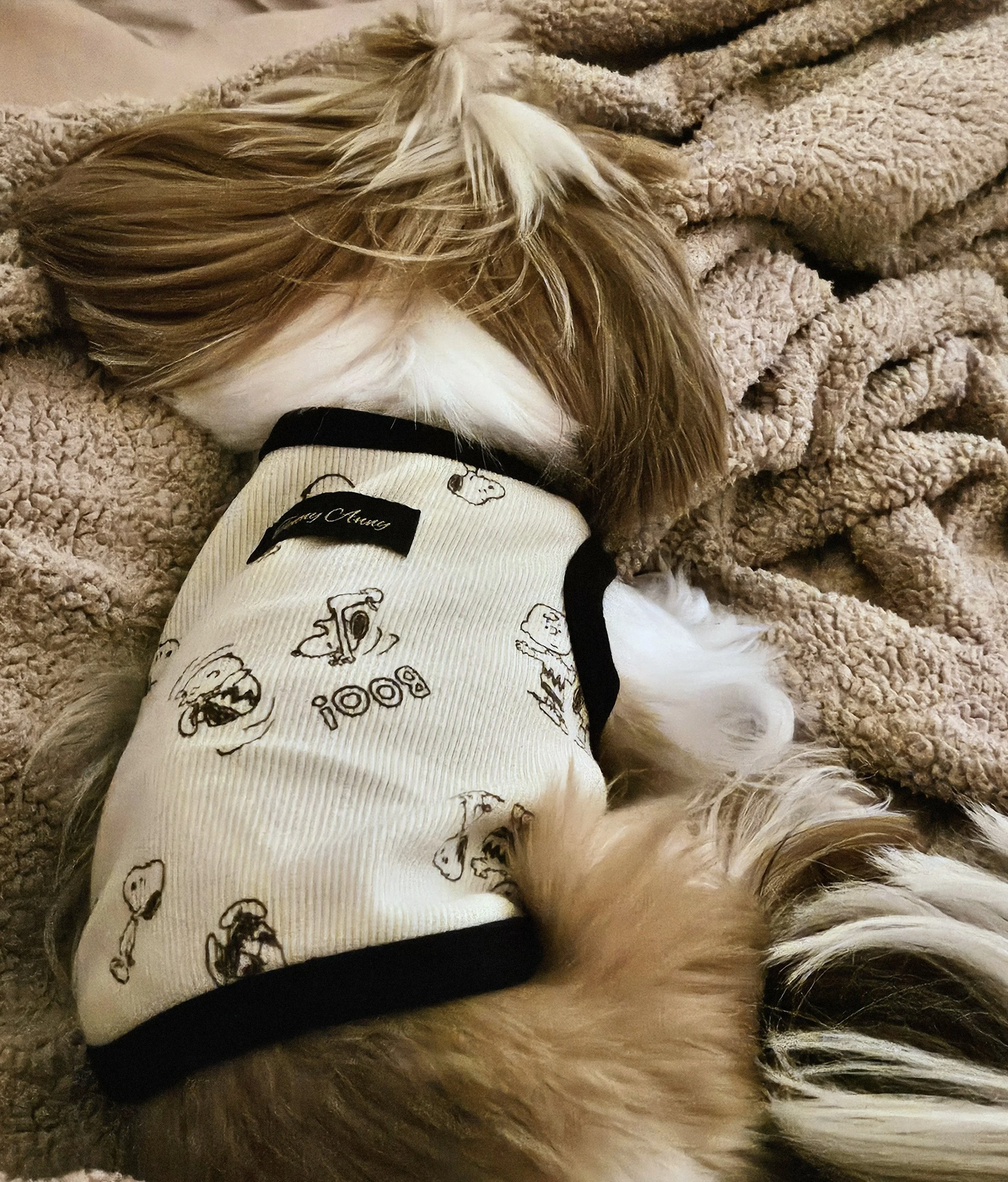 Let your pup relax in vintage charm with our Snoopy MilkTea Soft Vest. Featuring classic Peanuts characters in minimalist sketches over a warm milky beige base, this vest offers both style and comfort for everyday wear. Made from soft, breathable cotton with ribbed contrast trims, it's the perfect blend of cozy and cool for all seasons.
