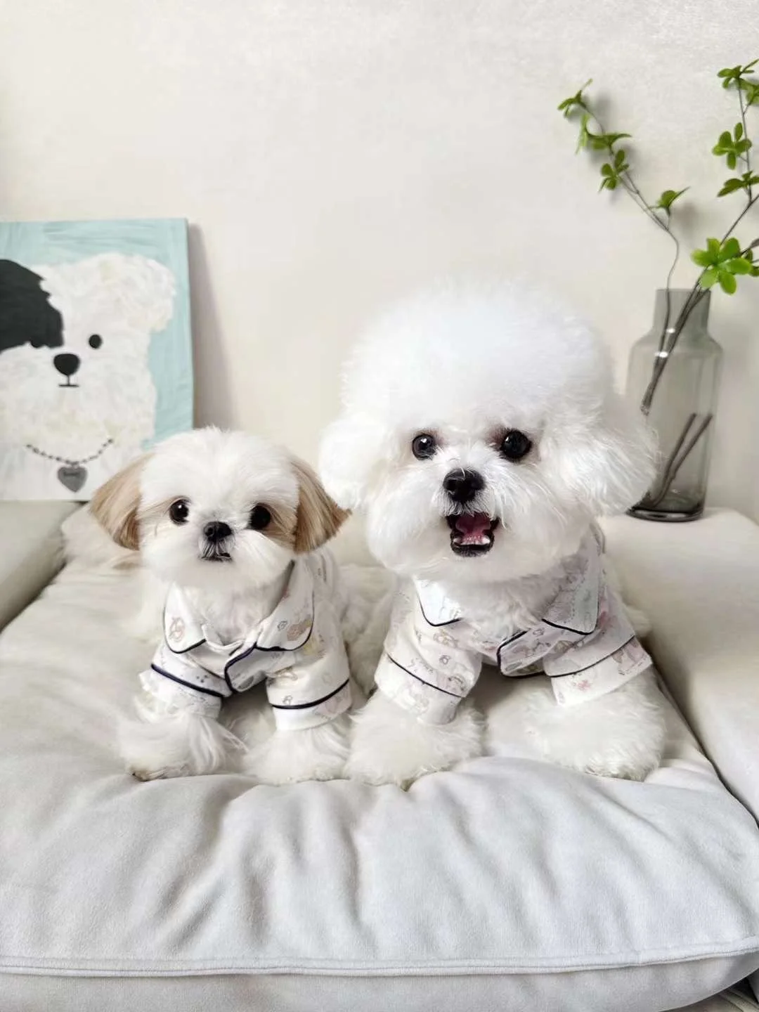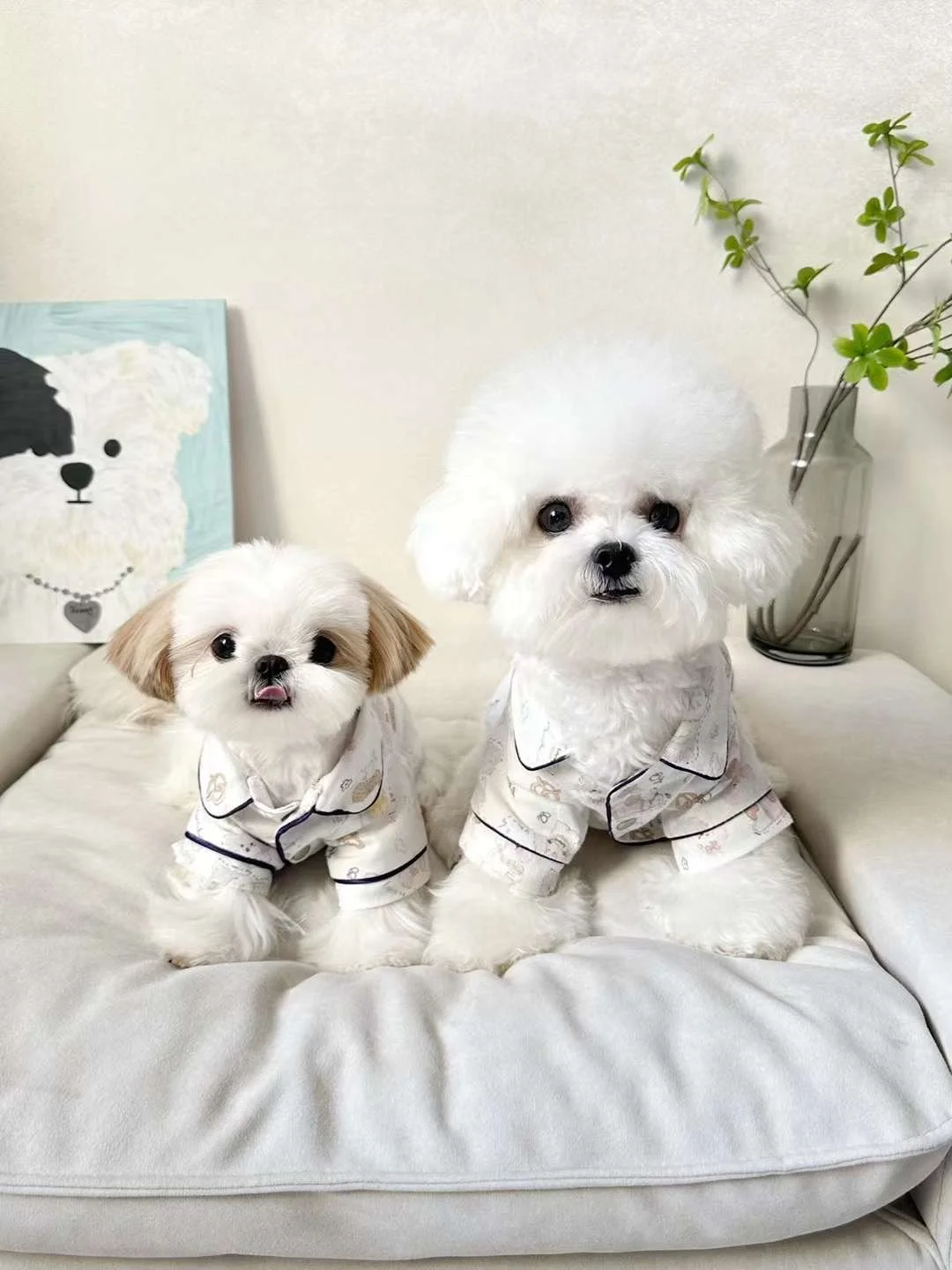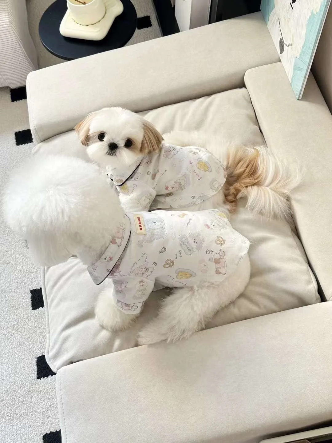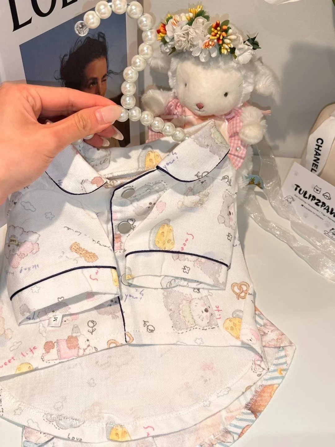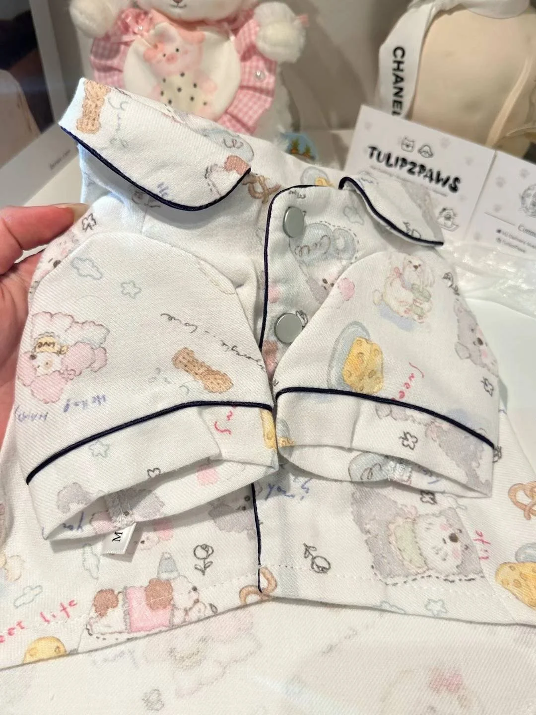 Treat your pup to cozy luxury with our White Dessert Lover Pajama Shirt. This adorable piece features a whimsical print of sweet treats and fluffy pups, perfect for bedtime cuddles or all-day lounging. The lightweight, breathable fabric keeps your furry friend comfortable while the piped collar detail adds a polished, pajama-inspired look.